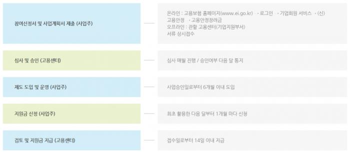 참여신청서와 사업계획서를 온라인 고용보험 홈페이지에 제출해도 되고, 오프라인으로는 관할 고용센터에 있는 기업지원부서에 접수하시면 됩니다. 정해진 제출 기한은 따로 없고 상시접수입니다. 심사는 매월 진행되고, 승인 여부는 다음 달 통지 되는데요. 승인된 후 6개월 이내 제도를 도입하면 됩니다. 지원금 신청은 최초 활용한 다음 달부터 매월 사업주가 관할 고용센터에 신청하는 방식인데요. 사실상 매월 해야 할 업무가 하나 더 늘어나는 것으로 볼 수도 있지만, 지원금을 생각하면 감수해야 할 부분이겠네요. 지원금은 신청 접수일로부터 14일 이내 지급된다고 합니다.