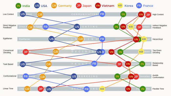 『규칙 없음』을 쓴 에린 메이어는 『컬쳐 맵』을 통해 나라별 문화적 특성을 이렇게 분류했습니다.