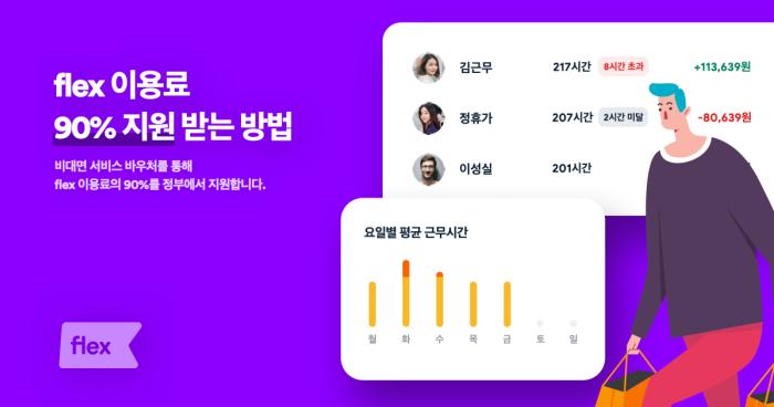 비대면 서비스 바우처 사업을 통해 flex 이용료 90% 할인 혜택을 꼭 챙겨가시길 바라겠습니다. 더 궁금하신 사항이 있다면, 오른쪽 아래 채팅상담을 통해 문의해주세요!
