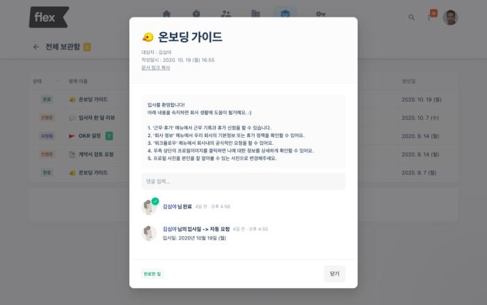각종 요청과 할 일을 구성원에게 알려주는 것 또한 인사관리 업무의 일종인데요. flex의 자동 워크플로우를 활용하면 특정한 이벤트에 맞춰 적합한 구성원에게 요청과 할 일을 자동으로 보낼 수 있습니다. 그리고 할 일을 받은 구성원이 해당 문서를 확인했는지, 요청을 완료했는지도 한 눈에 확인할 수 있죠.
