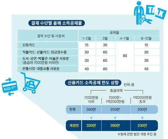하지만 무조건 많이 쓴다고 해서 공제를 더 많이 받을 수 있는 것은 아닙니다. 급여 기준에 따라 공제 한도가 있기 때문인데요. 공제 한도 역시 30만원씩 늘렸습니다.