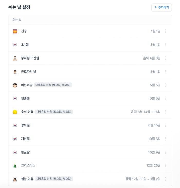 회사 정책에 따라 활성화와 대체휴일 허용 여부를 선택할 수 있습니다.