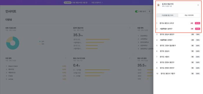 스마트 오피스 또한 실효성이 있으려면 결국 구성원의 거주지와 밀접한 거점 지역을 선정하는 것이 중요합니다. flex의 인사이트 기능을 통해 구성원의 거주 지역 분포를 파악하고 최적의 입지를 선정할 수 있습니다.