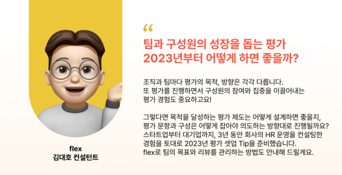 50인 이하 스타트업부터 1,000명 이상 대기업까지, 3년 동안 다수의 HR 운영 컨설팅 경험을 갖춘 flex 컨설턴트가 2023년 평가 셋업 Tip을 준비했습니다.