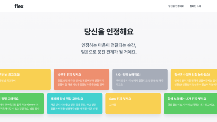 사람들이 저마다의 이유로 평소 전하지 못했던 ‘인정’을 보다 쉽게 주고받을 수 있도록 재미있게 플렉스팀에서 인정해요 캠페인을 구성했습니다. 많은 사람의 참여를 위해 관계를 이어주는 선물들도 준비했었는데요, 22년 5월 23일부터 시작된 캠페인에는 총 3,454건의 인정 메시지가 활발하게 오고 갔어요. 직장 동료, 선생님과 제자 등 다양한 관계의 분들이 인정 메시지를 통해 따뜻한 진심을 주고받았습니다.