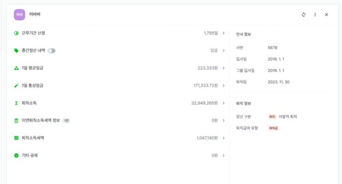 귀속월과 지급일, 퇴직자 조회 기간을 정하고 정산을 시작하면 대상자의 정산 금액을 바로 확인할 수 있어요. 근무 기간, 평균 임금, 통상 임금, 퇴직 소득 세액, 기타 공제 사항까지 확인하고 수정이 필요하면 바로 고칠 수 있습니다.