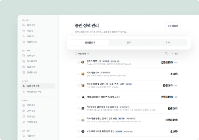 흩어져 있던 근무, 휴가, 워크플로우에 필요한 승인 라인을 승인 정책 관리 메뉴에서 한 눈에 조회하고 변경하실 수 있어요.