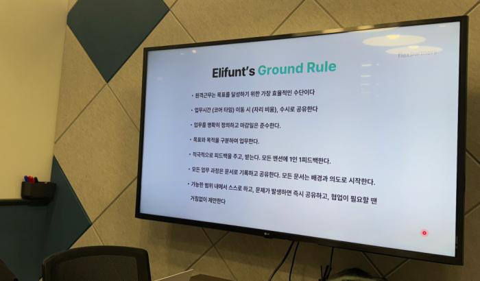 엘리펀트 컴퍼니는 5명 규모의 조직이지만, 그 어떤 조직보다 팀워크에 진심인 조직 문화를 만들어가고 있습니다. 1 on 1 미팅, 분기 워크샵, 위클리 개인사 공유, 그라운드 룰 회고, 원격 근무 등 업무와 커뮤니케이션에 걸림돌이 없도록 근무 환경을 갖춰나가고 있어요. 그 중에서도 유기적인 소통을 통해 업무 공유와 개선의 리듬을 빠르게 가져가는 문서 기반 커뮤니케이션을 고도화하고 있습니다.