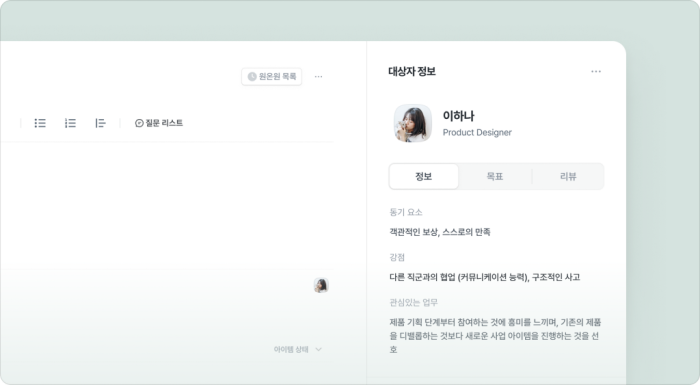 원온원에 도움이 되는 모든 정보를 한 번에 확인할 수 있어요. 두고두고 보고 싶은 구성원의 동기 요소/강점/관심 업무부터 구성원이 담당하고 있는 목표 혹은 지난번 받았던 리뷰까지. 원온원 히스토리도 한 눈에 훑어볼 수 있죠.