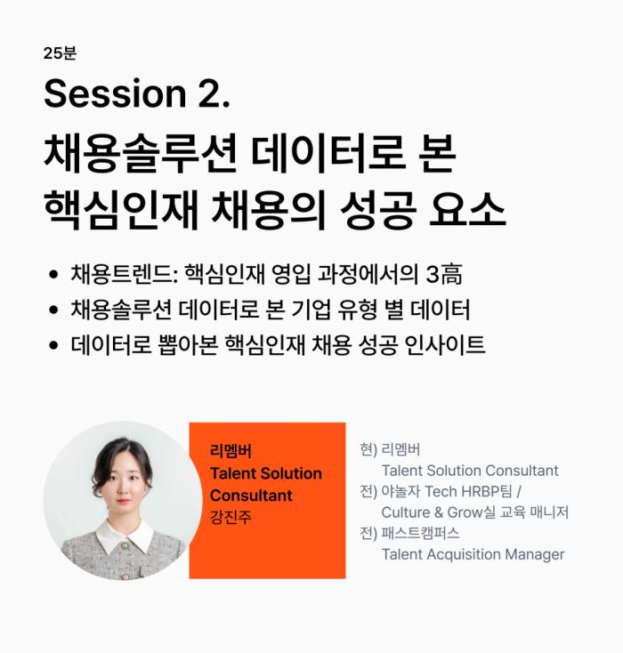 이번 세션은 우리 회사에 필요한 핵심인재를 잘 만나고, 함께 성장하는 HR 여정별 전략과 노하우를 다룹니다. 효과적으로 핵심인재를 영입하는 방법부터, 핵심인재로 성과를 창출하고 조직의 단단한 허리로 자리 잡게 만드는 리텐션까지. 중요한 HR 모먼트에 실행할 수 있는 전략과 실행 방안을 얻어가세요.
