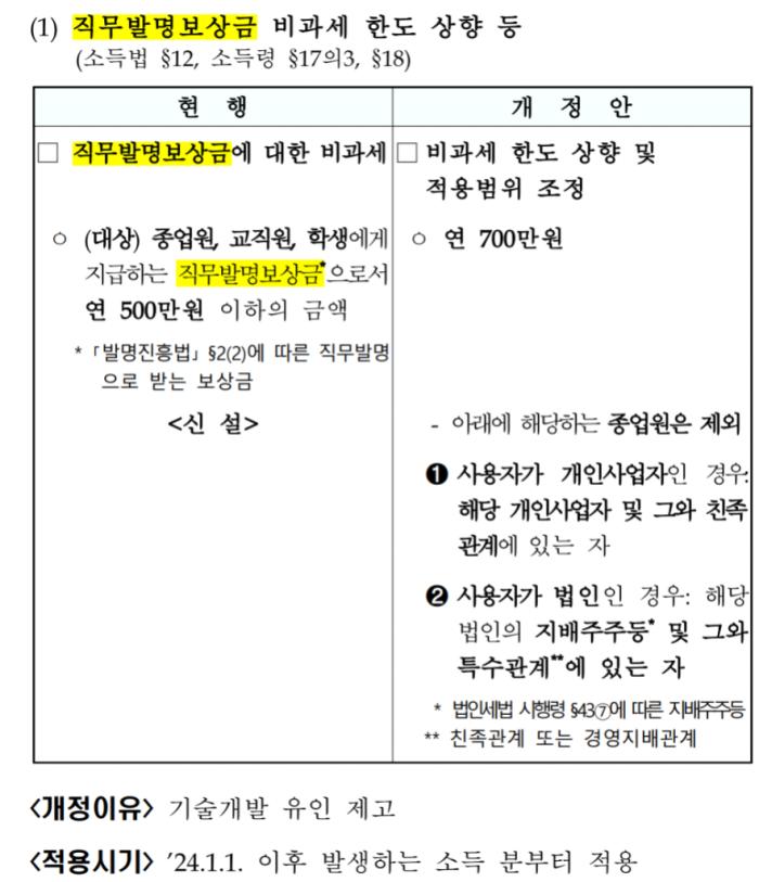 1. 직무발명보상금 비과세 한도 상향 등