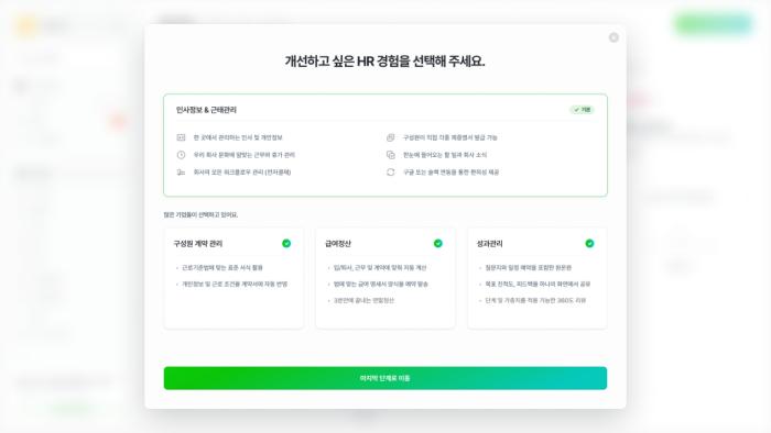 카드 등록 후 즉시 결제가 발생하지 않도록 설정하고, 고객이 구독 플랜별 가격을 명확히 인지할 수 있도록 디자인하였습니다. 그리고 설계한 흐름대로 유저는 카드 등록 후에 셀프 체험을 시작하였습니다. 하지만 새로운 프로세스를 통해 빠른 셀프체험을 원하는 페르소나의 니즈는 충족시킬 수 있었지만, 플렉스팀 컨설턴트의 전문성과 제품에 대한 가치 전달이 제대로 되지 않을 수 있어 유료구독전환율과 리텐션이 낮아질 수 있다는 우려가 있었습니다. 따라서 사전에 무료체험 중 사용성 분석 등을 통해 필수적으로 경험해야 할 4가지를 온보딩가이드에 녹여 최대한 인지시키고 행동을 유도했습니다. 또한 무료체험 중 언제든 필요하다면 컨설턴트와의 미팅도 신청할 수 있는 장치를 제품 내 만들어 두어 제품 혹은 사람이 아닌 제품과 사람의 조화를 통한 하이브리드 성장을 추구했습니다.