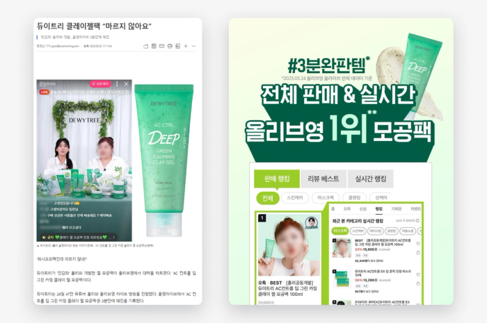 그때 유튜버 디렉터파이님이 매년 진행하는 선케어 제품 베스트 순위를 꼽는 콘텐츠가 있었는데, 여기서 듀이트리 제품이 TOP OF TOP 브랜드로 선정됐어요. 덕분에 올리브영 유통에 임팩트를 주고 MD들에게 주목도를 좀 높게 가져갈 수 있어서 그 시즌에 좋은 노출 구좌들을 확보할 수 있었어요.