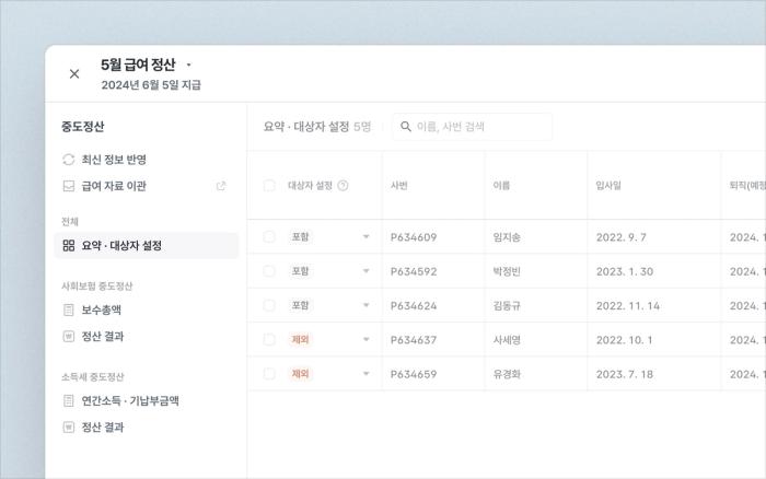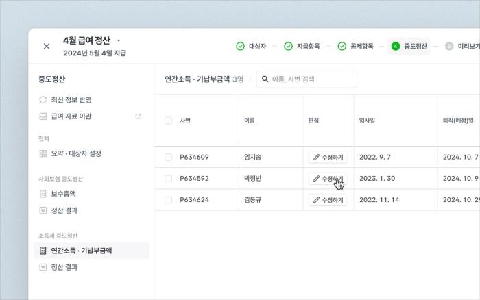 - 급여정산 메뉴에서 시작한 중도정산은 별도로 구분되며, 각 정산의 진행 상태도 확인할 수 있어요.