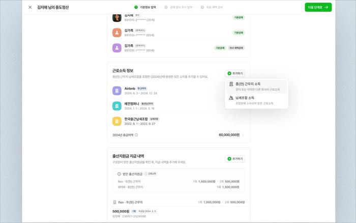 - 중도정산 테이블에서 대상자별 상세 화면으로 바로 이동하여 구성원별 연간소득, 가족정보 등을 자유롭게 수정할 수 있어요.