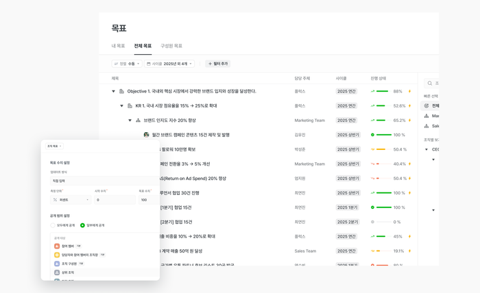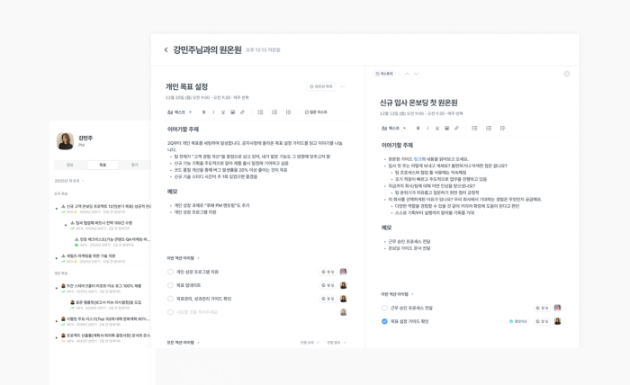 목표, 기간, 담당자, 진행 현황이 기록되고, 상하위 목표 간 연결도 쉽게 확인할 수 있어 구성원 입에서도 ‘왜 이 일을 하는지’를 납득하며 수시로 목표관리를 진행할 수 있습니다.