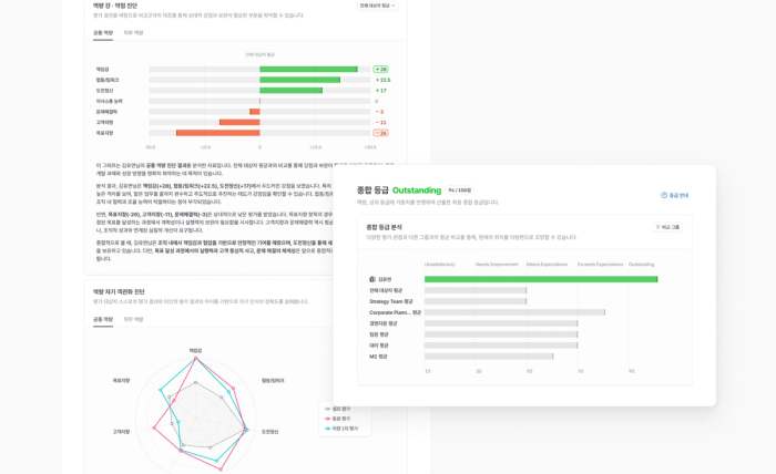 조직은 이 시스템을 통해 각기 팀과 구성원의 목표, 강점, 개선점을 한눈에 파악하고, 데이터 기반으로 성장의 기회를 설계할 수 있습니다.