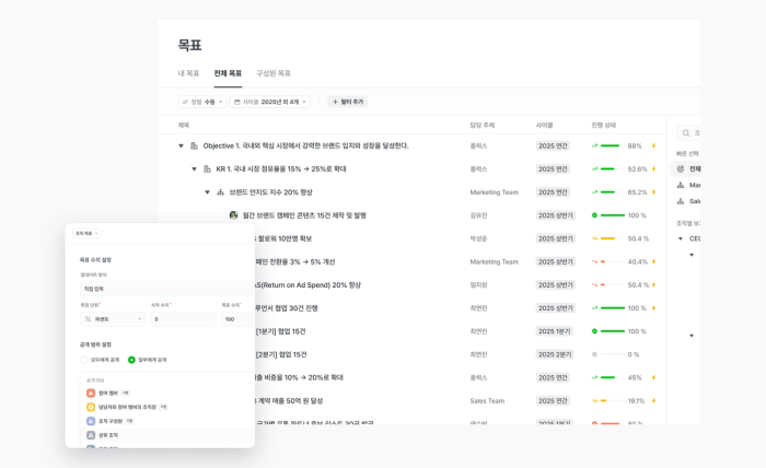 목표, 기간, 담당자, 진행 현황이 기록되고, 상하위 목표 간 연결도 쉽게 확인할 수 있어 구성원 입에서도 ‘왜 이 일을 하는지’를 납득하며 수시로 목표관리를 진행할 수 있습니다.