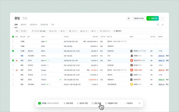 여러 장의 영수증을 하나의 지출결의서에 첨부할 때, 이제 일괄 제출 기능 으로 한 번에 처리할 수 있어요. 여러 건의 영수증을 각각 제출하는 번거로움 없이, 더욱 빠르고 간편하게 비용을 정산할 수 있습니다. 법인카드로 결제한 내역이 많거나, 출장 후 영수증을 한 번에 정리할 때 유용하게 사용해 보세요.