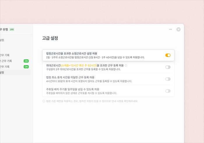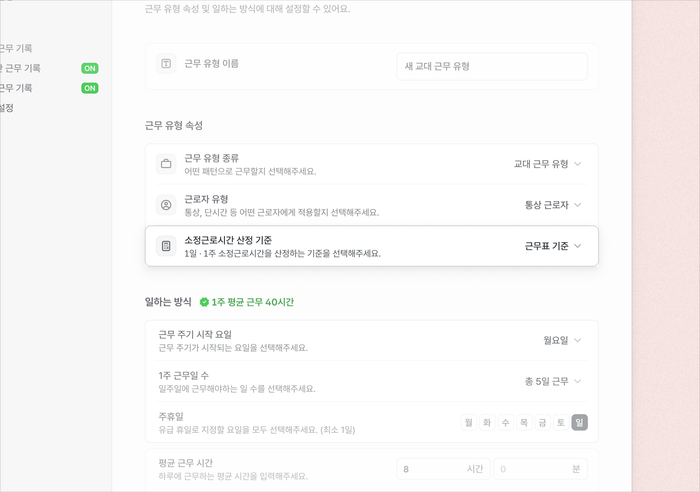 이제 회사의 근무 및 보상 정책에 더 정확하게 맞춘 근무 형태를 손쉽게 적용하실 수 있어요. 업무 환경이 다양한 만큼, 더욱 유연한 설정으로 효율적인 운영을 지원해 드릴게요!