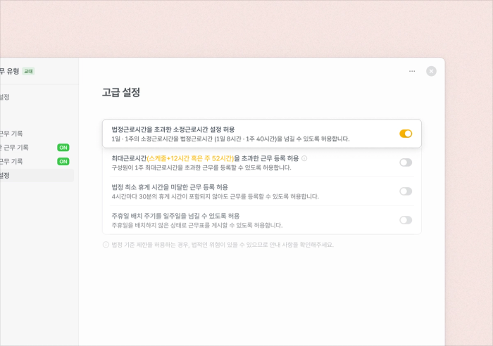 설정 > 근무유형 > 근무유형 고급설정 > 법정 소정근로시간(주 40시간)을 초과한 소정근로시간 설정 허용 화면