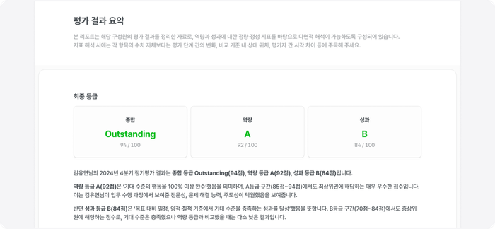 평가 근거가 투명하게 제시되기 때문에 구성원은 결과를 납득하고, 관리자는 피드백의 방향성을 명확히 제시할 수 있습니다.