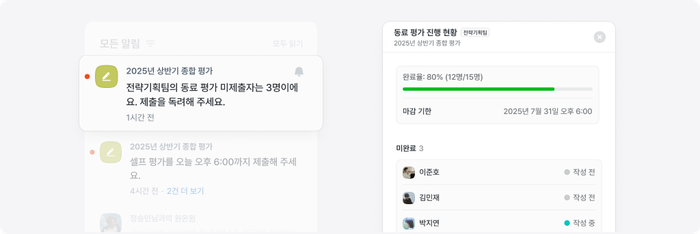 - 평가 일정·미작성자 자동 알림 발송으로 진행 현황 관리 효율화