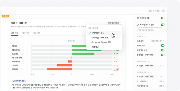 - 평가 결과를 데이터로 분석해 강점·개선점 자동 도출