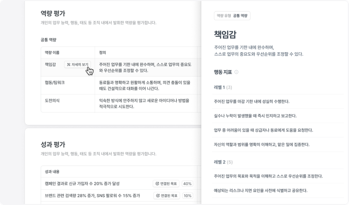 평가 근거가 투명하게 제시되기 때문에 구성원은 결과를 납득하고, 관리자는 피드백의 방향성을 명확히 제시할 수 있습니다.