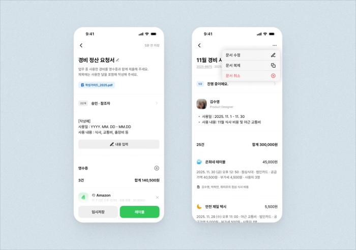 매번 처음부터 작성할 필요 없이 기존 문서를 불러와 빠르게 기안할 수 있습니다. 제목, 본문, 입력 필드, 결재라인이 그대로 복제되며 필요한 부분만 수정해 바로 제출할 수 있어요. 단, 첨부된 영수증 이미지는 복제 되지 않아요.