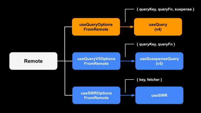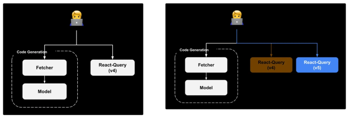 useRemote가 코드 생성 시점부터 React Query에 직접 의존하고 있었기에, 이러한 라이브러리의 파괴적 변경 사항은 전체 시스템으로 그대로 전파되었습니다.