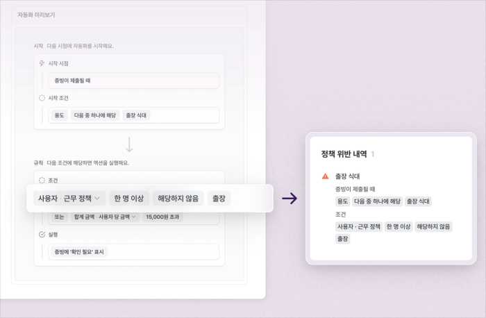 - (예시) 근무 정책이 '출장'이 아닌데 '출장비' 항목을 사용하면 위반으로 알림