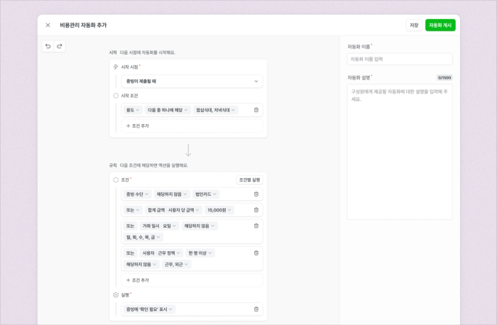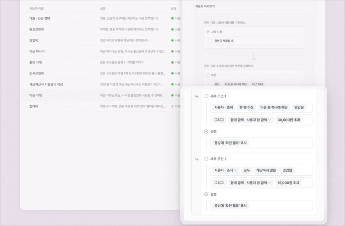 단순히 지출을 통제하던 '비용 정책'이, 이제 더 넓은 범위의 업무를 처리할 수 있는 [자동화 관리]로 새롭게 개편되었습니다. 이번 변화는 ‘영수증 발생 시 담당자 자동 지정’, ‘특정 조건 충족 시 자동 승인’과 같이 커스터마이즈 가능한 ‘시작 조건’과 ‘규칙’을 통해, 향후 우리 회사의 다양한 업무 흐름을 시스템이 스스로 처리하는 업무 자동화로 확장해 나가기 위한 첫 걸음입니다.