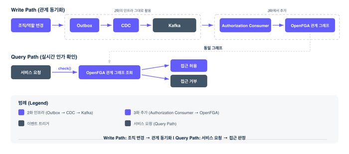 어디서 많이 본 구조 아닌가요? 2화에서 이야기한 Transactional Outbox + Debezium CDC + Kafka 파이프라인을 그대로 활용하고 있습니다. 새로운 메시징 인프라를 구축한 게 아닙니다. 이미 모든 도메인이 사용하고 있는, 신뢰성이 검증된 이벤트 스트리밍 레일 위에 인가 시스템을 올린 겁니다.