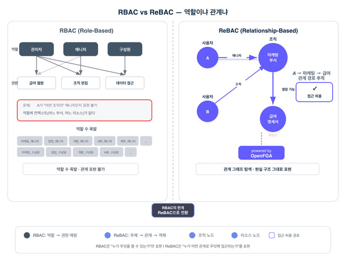 구체적으로 보겠습니다. RBAC에서는 "A에게 매니저 역할을 부여하고, 매니저 역할에 급여 열람 권한을 연결"합니다. 단순하지만, A가 어떤 조직의 매니저인지, 그 매니저 역할이 어디까지의 구성원에게 적용되는지를 표현할 수 없습니다. ReBAC에서는 "A는 마케팅 부서의 매니저이다", "마케팅 부서의 매니저는 해당 부서 구성원의 급여를 볼 수 있다"라는 관계를 직접 표현합니다. 관계의 종류(소속, 매니저, 열람자 등)와 대상(조직, 구성원, 프로젝트 등)이 모두 명시적입니다.