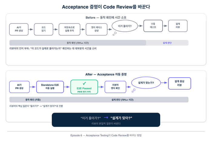 이건 AI가 코드를 더 많이 생성하게 되는 시대에서, 엔지니어의 시간을 가장 높은 가치의 판단에 쓰게 해주는 구조적 변화입니다. 수동 동작 확인이 아니라 구조적 acceptance 증명. 이것도 결국 1화의 "문서가 아니라 빌드가 지킨다"와 같은 사고방식입니다.