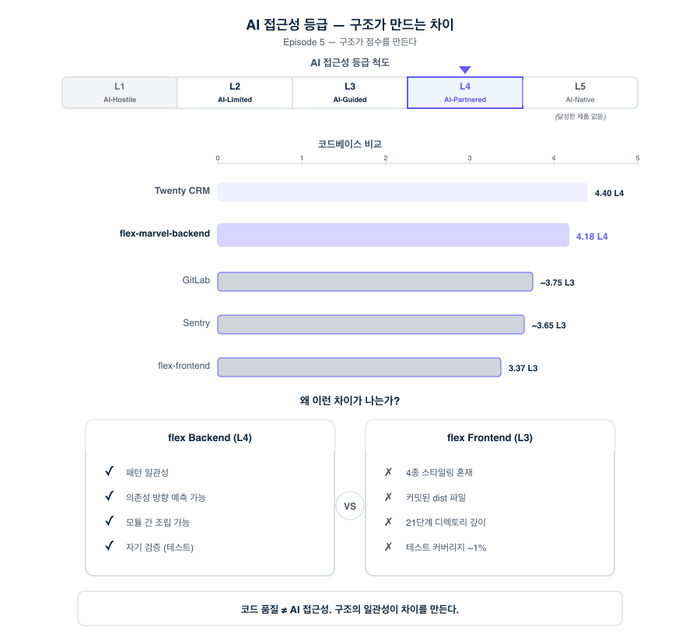 결과는 흥미로웠습니다. flex-marvel-backend는 L4(AI-Partnered, 4.18/5.0) 등급을 받았고, 이는 Twenty CRM을 제외한 대부분의 오픈소스 제품 코드베이스(GitLab, Sentry, Mattermost, Grafana 등)를 상회하는 수치였습니다. 같은 회사 안에서도 차이가 명확했는데, Frontend 코드베이스는 코드 품질 자체는 4.1로 높았지만 AI 접근성이 2.63에 그쳐 L3(AI-Guided) 등급이었습니다.