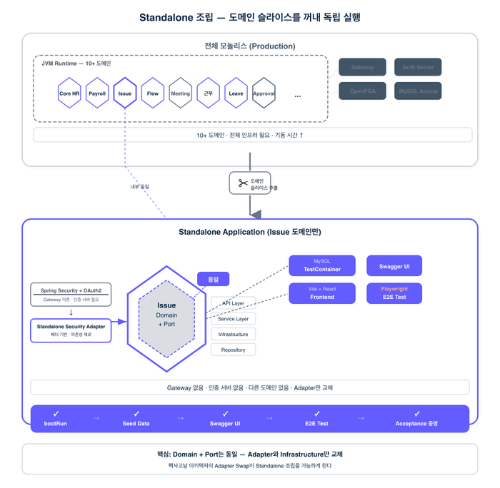 flex의 도메인 모듈은 1화에서 이야기한 'flex-skeleton' 템플릿을 기반으로 만들어지기 때문에, Port/Adapter의 경계가 명확합니다. 이 경계가 명확하기 때문에, 특정 도메인만 꺼내서 Adapter를 교체하고 독립 실행 가능한 애플리케이션으로 조립할 수 있습니다. 실제로 flex-flow-backend의 Issue 도메인에는 'standalone-app'이라는 모듈이 있습니다. 이 모듈은 Issue의 API, Service, Infrastructure, Repository 모듈을 조립하되, 프로덕션의 Spring Security + OAuth2 인증 Adapter 대신 단순 헤더 기반의 Standalone Security Adapter를 끼워 넣습니다. Gateway도, 인증 서버도, 다른 도메인도 없이 — Issue 도메인만 독립으로 기동됩니다.