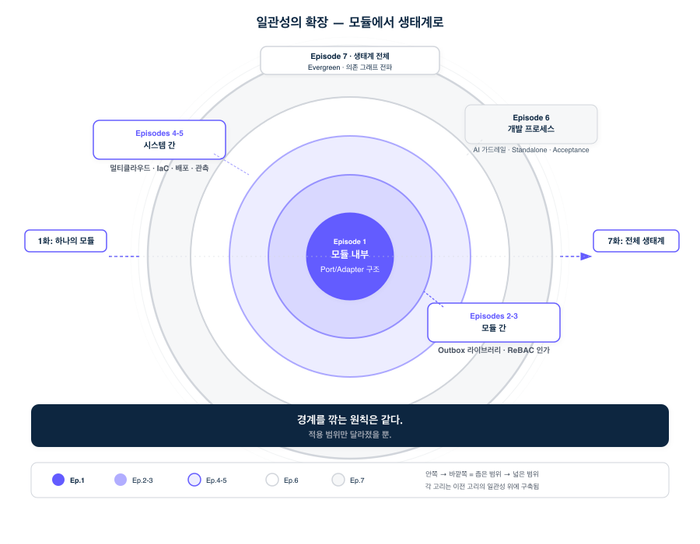 지난 여섯 편을 통해, 경계를 깎아 모듈을 만들고 그 경계가 인과 사슬로 이어지는 과정을 따라왔습니다. 하지만 여기까지의 이야기는 대부분 하나의 레포, 혹은 하나의 배포 단위 안에서 일어나는 일이었습니다.