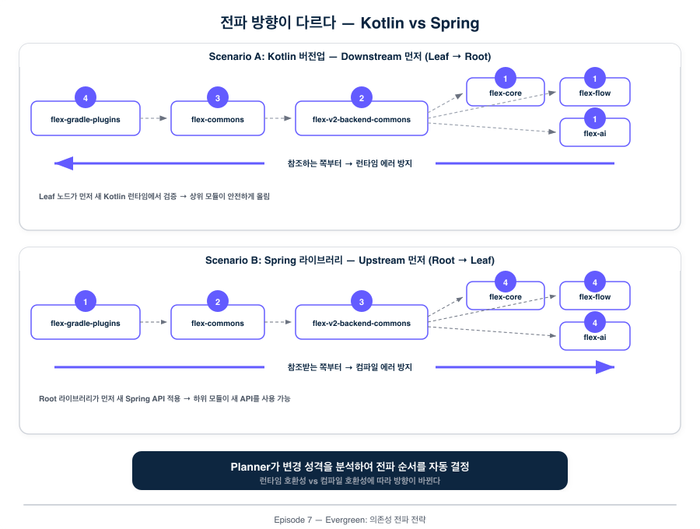 Planner는 레포 간 의존 관계를 파악하고, 변경이 전파되어야 하는 순서를 결정합니다. 이건 단순한 목록이 아닙니다. Kotlin 버전을 올릴 때는 참조하는 쪽(downstream)부터 올려야 런타임 에러를 방지할 수 있고, Spring 라이브러리를 올릴 때는 참조받는 쪽(upstream)부터 올려야 컴파일 에러를 방지할 수 있습니다. 변경의 성격에 따라 전파 방향이 달라지고, Planner가 이 순서를 자동으로 결정합니다.