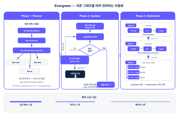 flex는 이 문제를 Evergreen이라는 내부 플랫폼으로 풀고 있습니다. 핵심은 "의존 관계 그래프를 분석하고, 그 방향을 따라 순서대로 마이그레이션을 전파하는 것"입니다.