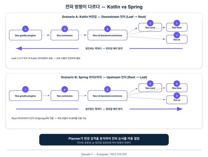 Planner는 레포 간 의존 관계를 파악하고, 변경이 전파되어야 하는 순서를 결정합니다. 이건 단순한 목록이 아닙니다. Kotlin 버전을 올릴 때는 참조하는 쪽(downstream)부터 올려야 런타임 에러를 방지할 수 있고, Spring 라이브러리를 올릴 때는 참조받는 쪽(upstream)부터 올려야 컴파일 에러를 방지할 수 있습니다. 변경의 성격에 따라 전파 방향이 달라지고, Planner가 이 순서를 자동으로 결정합니다.