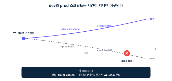 "dev에 배포하는 스크립트"와 "prod에 배포하는 스크립트"는 한날 한시에 갈라지지 않습니다. 처음엔 클러스터 인증 정보와 환경 변수 몇 개만 다를 뿐입니다. 그런데 서비스가 자라면서 두 파일은 조용히 갈라집니다. dev에만 붙는 디버그 플래그, prod에만 추가되는 리소스 제한, qa에만 켜지는 기능 플래그. 각 환경의 "특수 상황"이 스크립트에 박히는 순간, 두 파일은 사실상 다른 파이프라인입니다.