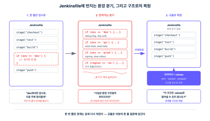 문제는 그 한 줄이 혼자 살지 않는다는 점입니다. 다음 달에 비슷한 상황이 오면, 선례가 있으니 누군가 똑같은 방식으로 한 줄을 더 넣습니다. 이어서 qa 분기가 생기고, prod에만 도는 로직이 슬쩍 얹힙니다. flex 초기에도 Jenkinsfile 안에 `if (env == "prod")` 블록이 서너 군데 박혀 있던 시기가 있었습니다. 겉으로는 "하나의 파이프라인"이었지만, 안에는 환경 수만큼의 다른 파이프라인이 한 파일에 엉켜 있던 셈입니다.