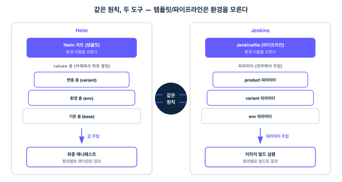 이 편을 한 문장으로 요약하면 이렇습니다. 템플릿은 "앱이 무엇인가"만, 동기화 도구는 "그 앱을 어느 클러스터에 어떤 정책으로 둘 것인가"만, 값의 층은 "그 앱이 이 환경에서는 어떤 값으로 켜지는가"만 말한다. 세 역할이 서로의 영역을 침범하지 않을 때, 배포 코드는 환경을 몰라도 됩니다. 환경을 아는 건 값의 층 하나뿐이고, 그 층들은 서로 위에 얹히며 diff로 비교할 수 있는 형태로 놓입니다. 이미지 빌드 파이프라인도 예외가 아닙니다 — 같은 규율이 Jenkinsfile 한 장에 그대로 적용됩니다.