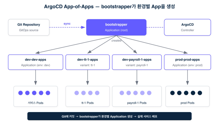 셋째, 새 앱을 추가할 때 파이프라인 코드가 바뀌지 않습니다. 뿌리는 선언된 목록을 보고 자식들을 펼치므로, 새 서비스가 하나 생겼다는 건 환경 층 values에 한 줄이 추가되고 해당 환경에서 켜진다는 뜻일 뿐입니다. 그 이상은 없습니다.