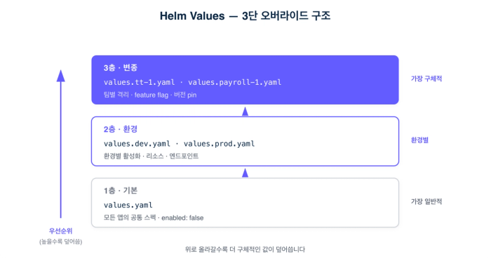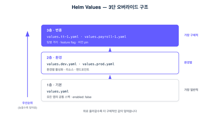 flex의 Kubernetes 배포는 Helm 차트 위에 올라갑니다. 중요한 건 차트 자체가 아니라, 거기에 주입하는 값(values)을 세 층으로 쌓는 규율입니다. 각 층은 자기가 무엇을 알고 무엇을 모르는지가 분명합니다.