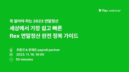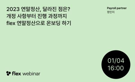 [flex webinar] 1시간으로 끝내는 2024년 귀속 연말정산 완벽 대비세션2024. 11. 114분기의 마지막, 13월의 연말정산을 준비하는 분들을 위해 플렉스팀이 올해도 어김없이 연말정산 웨비나를 준비했습니다.