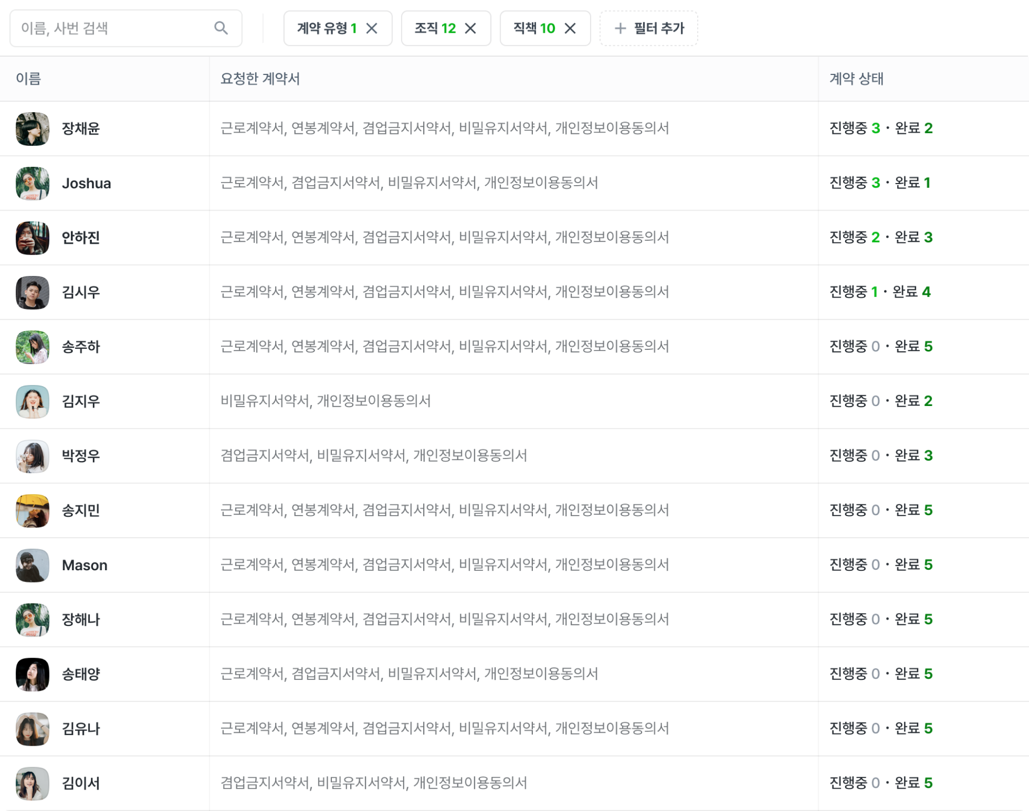 인사업무를 하다 보면 근로계약뿐 아니라 다양한 형태의 계약서를 구성원들에게 요청하는 경우가 많은데, 각종 양식을 쉽게 작성해서 요청할 수 있다는 점이 너무 편하더라고요.