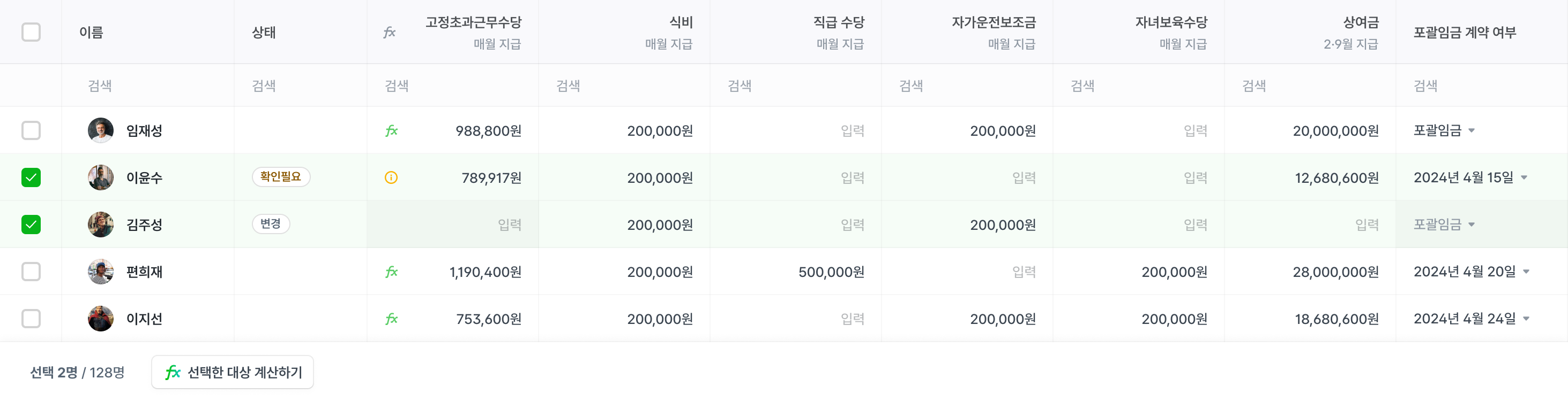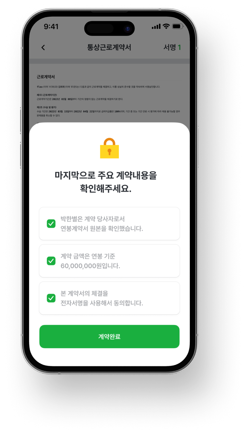 근로 및 연봉계약서를 작성할 때 flex 정보를 통해 통상시급, 기본급, 고정초과근무수당이 자동으로 입력돼요.
